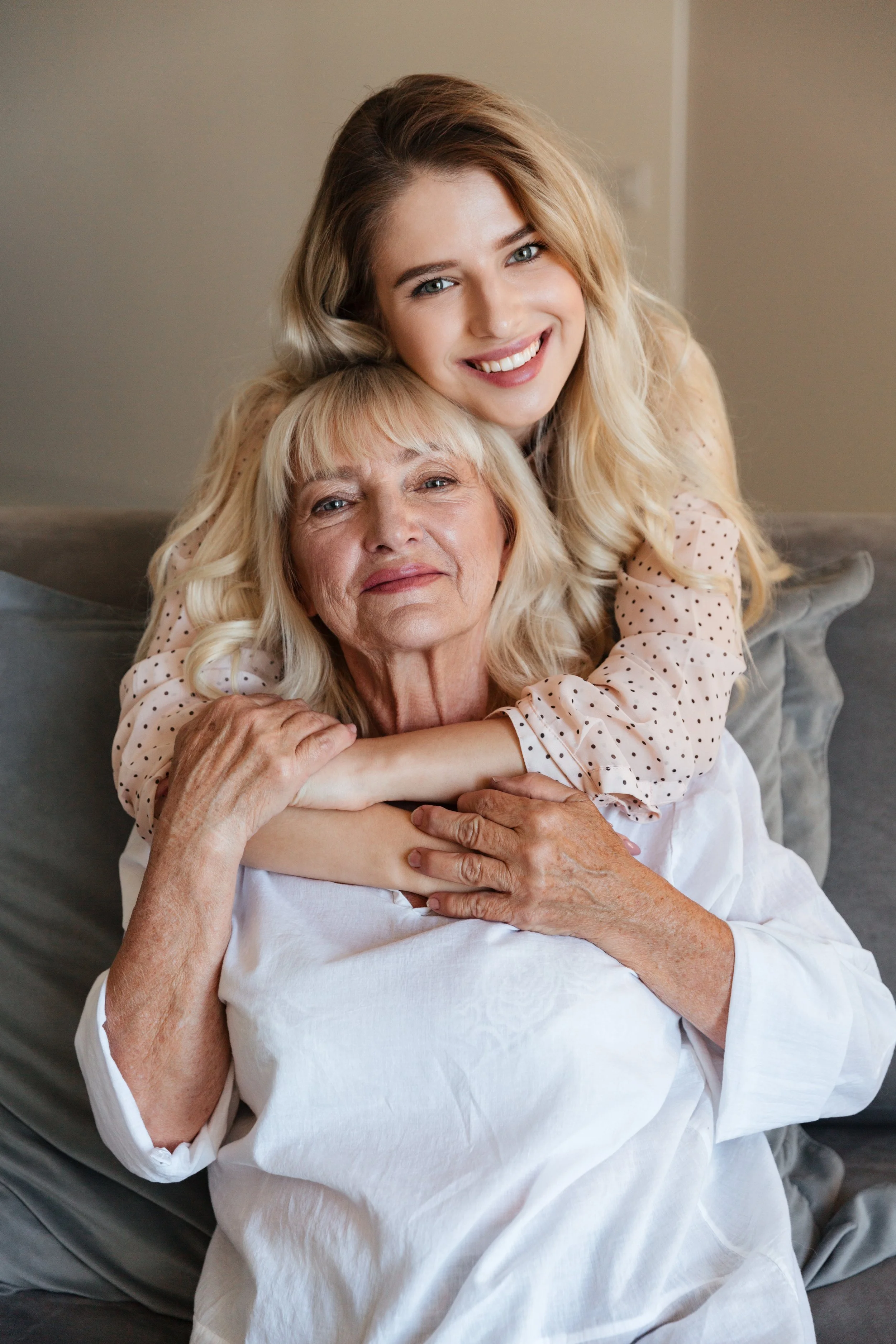 A young woman with blonde hair hugging an elderly woman with gray hair, both smiling and sitting on a sofa in a cozy indoor setting.