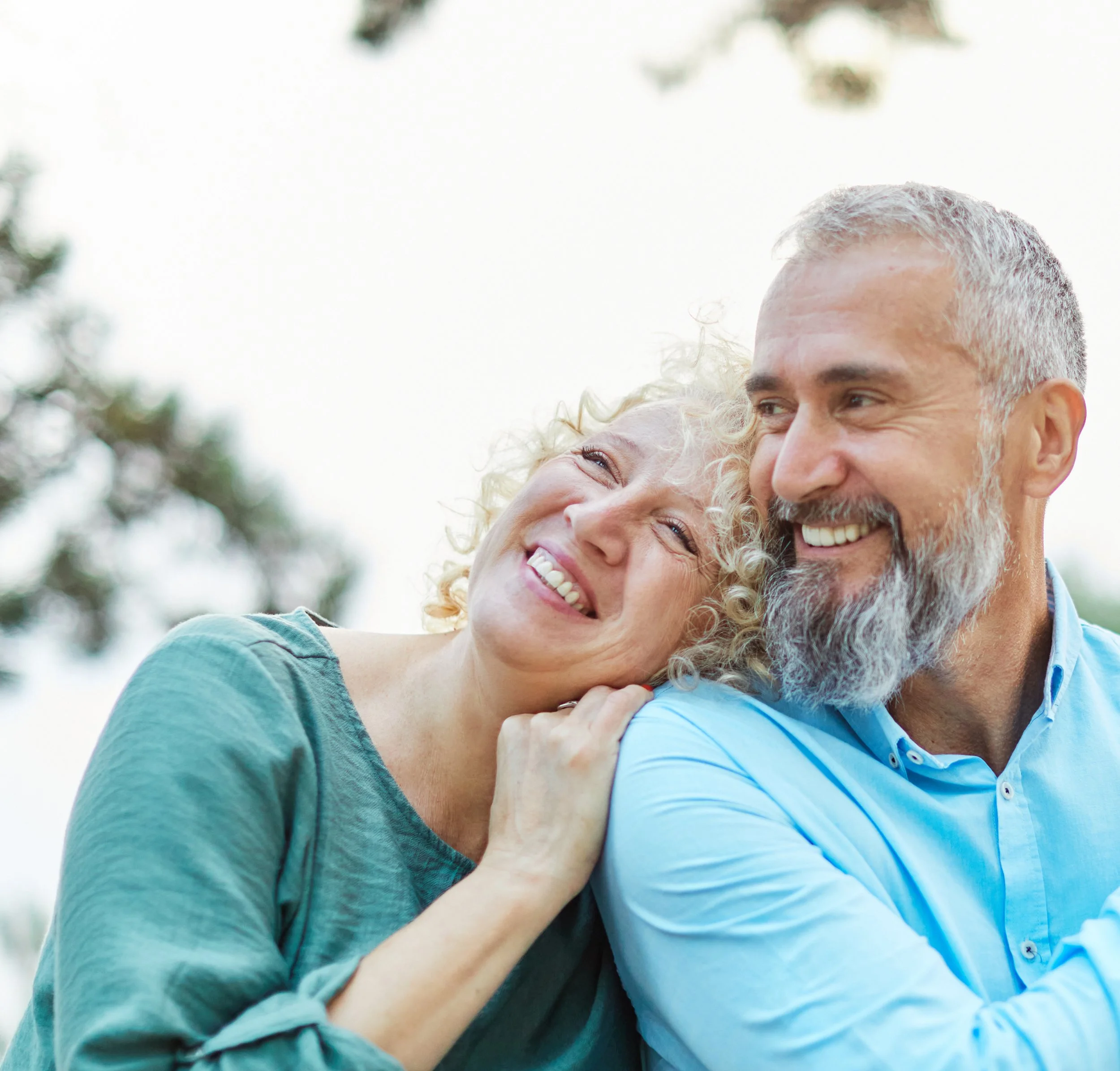 A smiling elderly woman leaning her head on a man's shoulder against a background of trees.